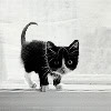 Description: A black-and-white kitten looking at the camera